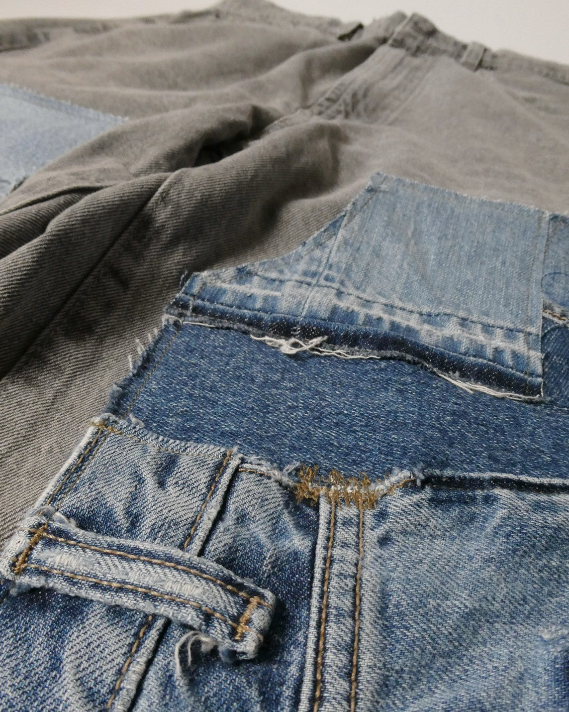 パッチワークはアイテムごとに別物となるのはもちろん、1本のデニムにおいての左右のバランスにもハンドメイドの技を見ることができる。