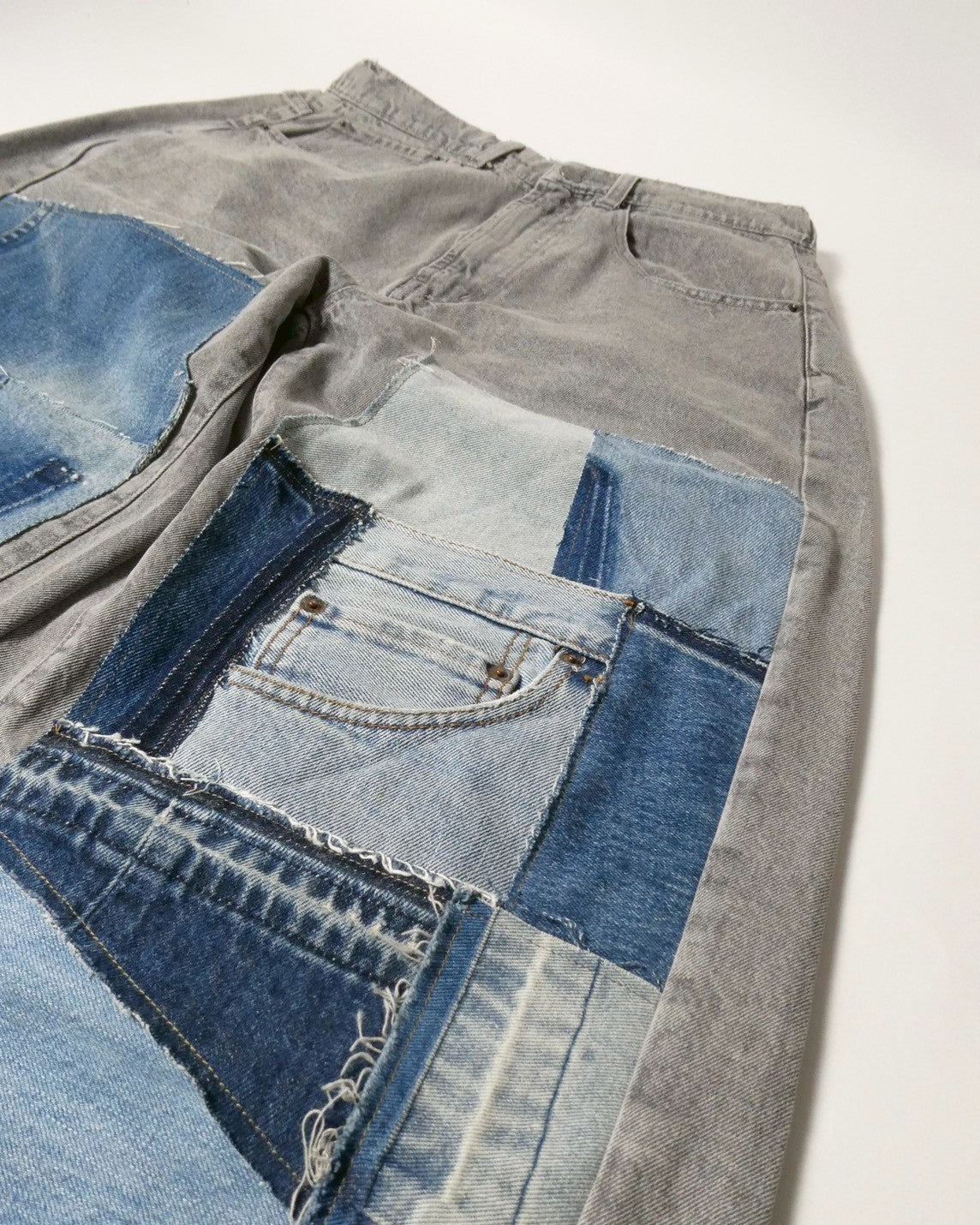 パッチワークはアイテムごとに別物となるのはもちろん、1本のデニムにおいての左右のバランスにもハンドメイドの技を見ることができる。