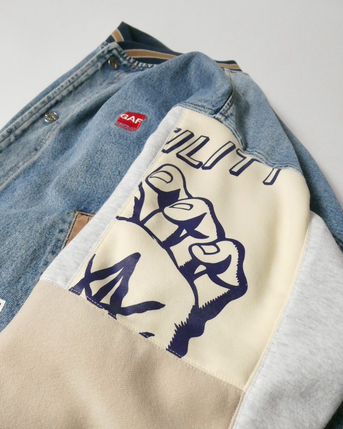 古着のデニムスタジャンをベースに袖をパッチワークされた裏起毛スウェットで切り替えられています。