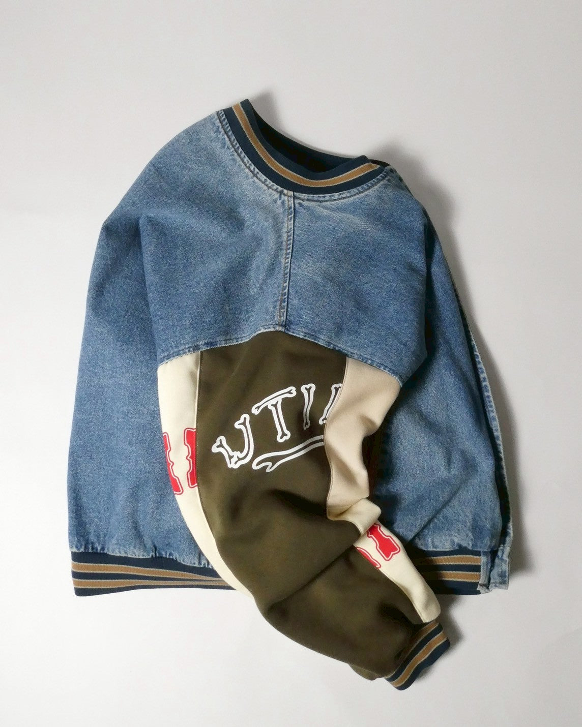 古着のデニムスタジャンをベースに袖をパッチワークされた裏起毛スウェットで切り替えられています。