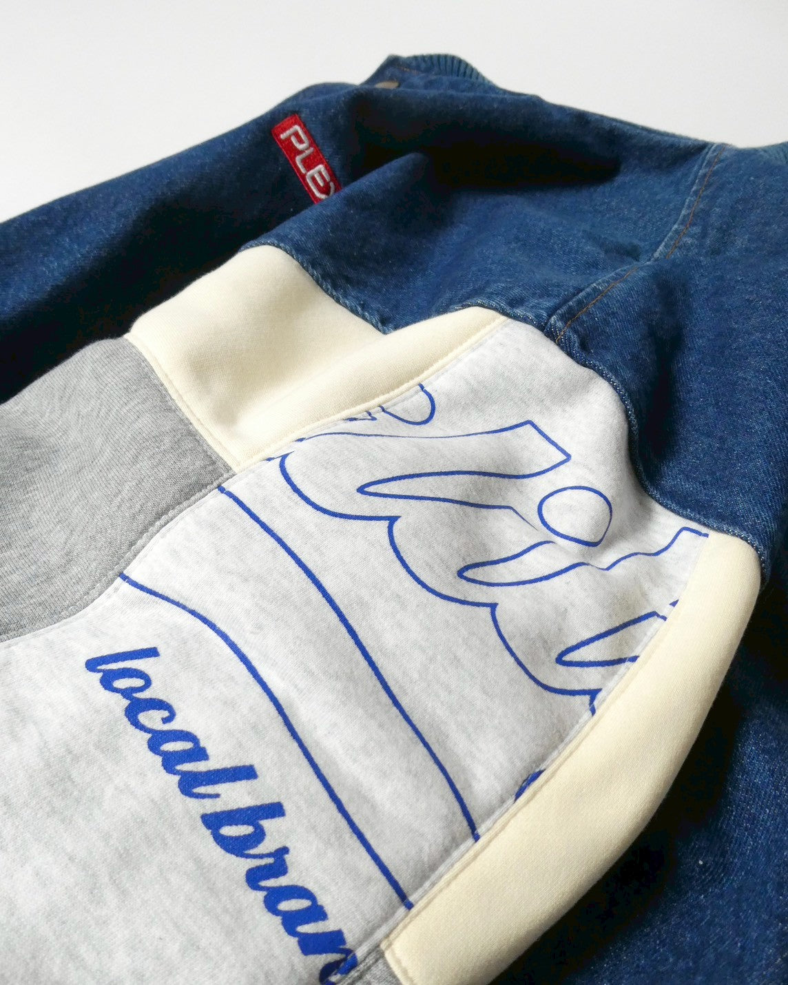 古着のデニムスタジャンをベースに袖をパッチワークされた裏起毛スウェットで切り替えられています。